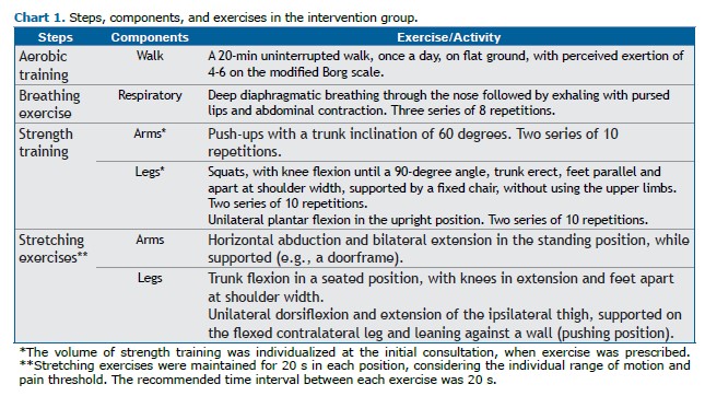 Information on the program was provided via an illustrated booklet, with a tracking page for exercise completion. The exercises were divided into four parts: aerobic training, breathing exercises, strength training, and stretching. Exercise volume was prescribed on the basis of individual functional capacity, with a 20-s rest between sets (Chart 1).(3,5,30)
