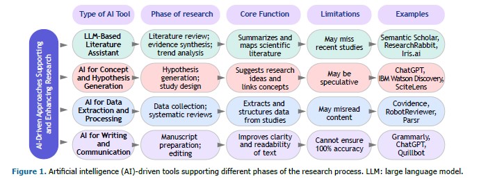 Beyond literature review, AI offers additional capabilities. It can process and analyze large study datasets, generate code for statistical platforms, such as R or Python, and identify patterns or associations that might otherwise be overlooked. LLMs can be used to rewrite text, proving editorial support. At the publication stage, journals are increasingly adopting AI-based systems for research integrity checks and automatically screen manuscripts for potential plagiarism or fabricated information with high accuracy.