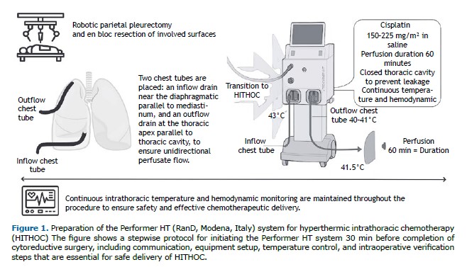 Hyperthermic intrathoracic chemotherapy (HITHOC) has emerged as a promising intraoperative strategy to enhance locoregional control. HITHOC delivers high concentrations of cytotoxic agents—most commonly cisplatin (150-225 mg/m2)—via a heated perfusate (42°C) maintained for 60 min within a closed pleural circuit, thus ensuring improved tissue penetration and minimal systemic absorption.(1-3)