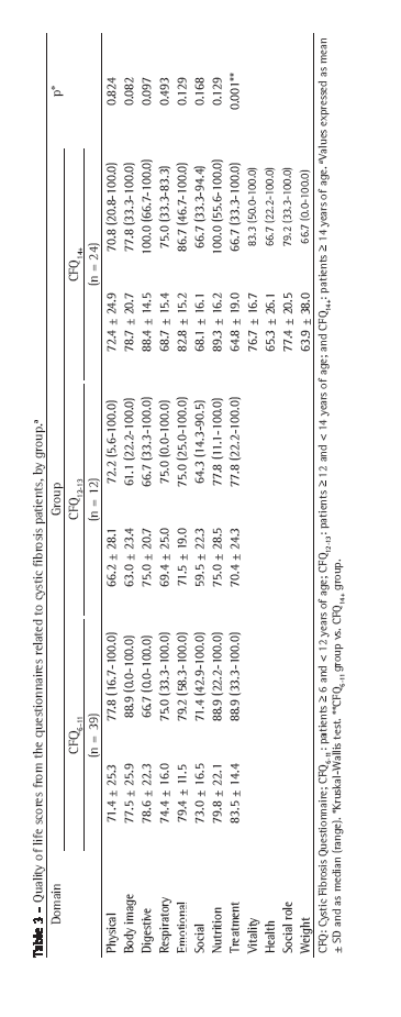 The objective of the present study was to employ the CFQ as a means of assessing the QoL of patients with CF followed at a university hospital referral center for CF.