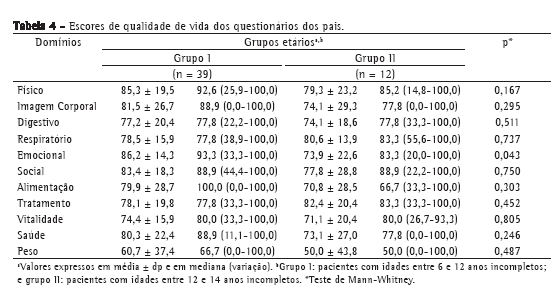 Na Tabela 4, são apresentados os dados referentes aos questionários respondidos pelos pais. Só encontramos uma diferença significante entre os grupos I e II no domínio emocional (p = 0,043). Observamos uma boa concordância entre as médias dos escores dos pais com as informações obtidas pelos questionários aplicados aos pacientes.
