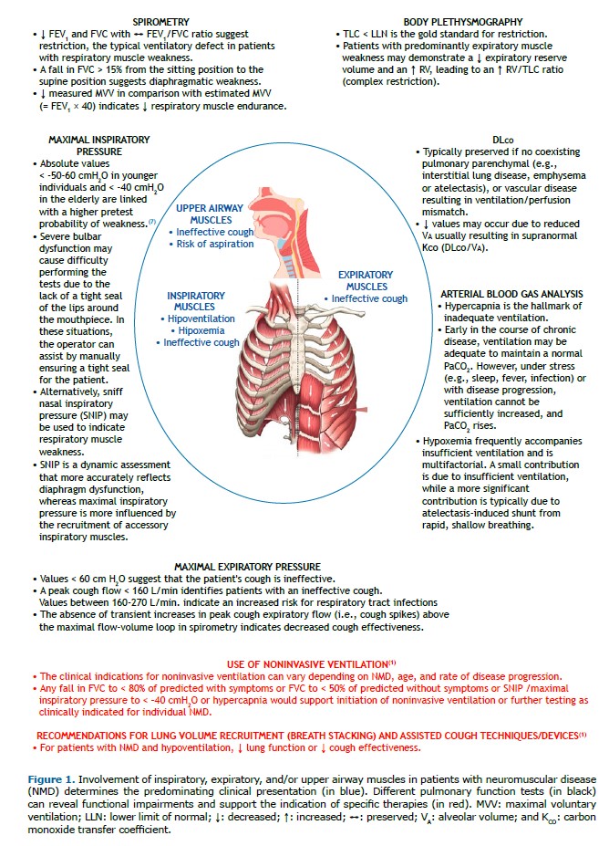 Neuromuscular disease (NMD) can affect all respiratory muscle groups, and respiratory complications are the major cause of morbidity and mortality.(1) The duration of symptoms varies depending on the underlying diagnosis. NMD can be acute (e.g., Guillain-Barré syndrome; acute spinal cord or phrenic nerve trauma or infarction; epidural abscess; acute poisoning; drug-related NMD; metabolic disturbances; tetanus or other infections; and acute myasthenic crisis) or present slowly over months (e.g., amyotrophic lateral sclerosis, multiple sclerosis, spinal cord tumors, myasthenia gravis, syringomyelia, muscular dystrophy, and myotonic dystrophy). In the latter context, pulmonary function tests (PFTs) play a prominent role in objectively assessing respiratory muscle strength and potential consequences of weakness of the respiratory system (Figure 1).