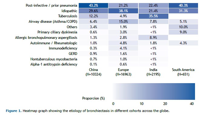 There has been substantial progress in our understanding of bronchiectasis in recent years. It is well established that bronchiectasis is characterized by a neutrophilic airway inflammation, but a new finding is the recognition that 20% of patients with bronchiectasis have an eosinophilic profile, which has implications in the risk of exacerbations.(1) Research on microbiome has illustrated the importance of microbial interactions and the potential role of commensal microbes in the pathogenesis of exacerbation.(2) Multicenter cohorts have informed us about the most common causes of bronchiectasis in different areas of the globe (Figure 1).(3-6) In South America, the most common causes of bronchiectasis in a study(4) that included 651 patients were post-infective (40.3%), idiopathic (31.3%), primary ciliary dyskinesia (9%), airway disease (5.1%), rheumatologic disease (4.3%), and other causes (10%).In that cohort, the post-infective etiology included both tuberculosis and other lung infections.(4)