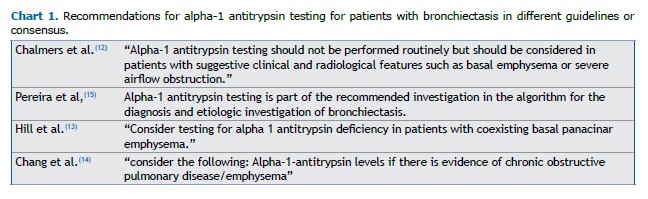 The study has important clinical implications. Currently, most guidelines or consensus on bronchiectasis recommend testing A1AT deficiency conditional on the presence of emphysema or basal emphysema or panlobular emphysema.(13-15) The exception is the Brazilian consensus, which recommends routine investigation for A1AT deficiency in such patients (Chart 1).(16) However, if the investigation for A1AT deficiency is predicated on the presence of emphysema, many patients (probably the majority) with A1AT mutations will be missed. A more reasonable approach would be to test patients with bronchiectasis for A1AT deficiency in the presence of emphysema or if the cause of bronchiectasis has yet to be clearly established. As shown in Figure 1, large multicenter cohorts of patients with bronchiectasis consistently show that an etiology for bronchiectasis cannot be established in approximately one third of patients. Another important implication is that reliance on isolated A1AT levels is likely to miss many patients with pathogenic A1AT variants, which illustrates the importance of adding genotyping to the investigation. Moving forward, it will be interesting to conduct a similar study in a multicenter Brazilian cohort, as well as a comparison of the prevalence of pathogenic variants in the general population with that of patients with bronchiectasis, which will provide a better understanding of the magnitude of A1AT deficiency as an etiology of bronchiectasis.