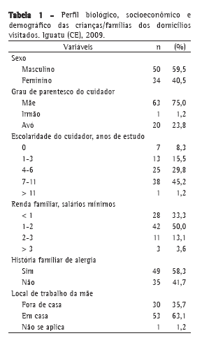 Na Tabela 1, apresentam-se os dados relativos ao perfil biológico, socioeconômico e demográfico das crianças/famílias dos domicílios visitados.