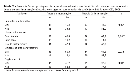 A Tabela 2 aborda os fatores desencadeantes para a asma existentes nos domicílios das crianças com asma. Após a intervenção, houve diferenças significativas na limpeza dos pisos com vassoura (p = 0,02) e no uso de fogões a carvão (p = 0,001).