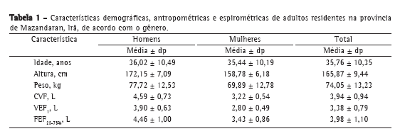 Há diferenças significativas entre os valores de referência, dependendo das fórmulas empregadas. Para serem generalizáveis, esses valores devem ser obtidos pelo estudo de amostras representativas da população geral.(2) Recomenda-se que esses padrões sejam estabelecidos pelos governos.(1) Atualmente é aceito que centros de referência devem produzir valores de referência pelo estudo de amostras de indivíduos saudáveis em sua região.(2) Um estudo envolvendo 41 estudantes de medicina do sexo masculino entre 23 e 26 anos de idade, realizado em 1994 na cidade de Zanjan, no Irã, mostrou que a média da CVF na população estudada foi de 90% do valor previsto.(4) Outro estudo, envolvendo 423 crianças e adolescentes, foi realizado em 2000 na cidade de Isfahan, no Irã.(5) Os autores mostraram que há diferença entre os valores de referência mais utilizados e aqueles obtidos para a população geral do Irã.(5) Um estudo realizado na Espanha por Castellsagué et al. em 1998 demonstrou diferenças entres as etnias em termos dos volumes pulmonares.(6) Gore et al. observaram que os valores de referência mais utilizados eram aplicáveis a indivíduos brancos na Austrália.(7) Em um estudo realizado por nosso grupo em 2006 na cidade de Sari, no Irã, observamos que os valores espirométricos (CVF, VEF1 e FEF25-75%) para adultos saudáveis (≥ 18 anos de idade) eram mais semelhantes aos valores de referência da European Respiratory Society (ERS) que a outros padrões.(8) Fórmulas matemáticas comuns utilizadas para calcular índices espirométricos padrão geralmente se baseiam em valores obtidos para amostras pequenas de indivíduos saudáveis na Europa ou nos Estados Unidos, e esses valores são generalizados para a população mundial, independentemente do fato de que há diferenças antropométricas entre as raças e diferenças ambientais entre as regiões.