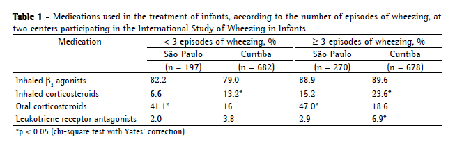 The comparison between the findings from the investigation of infants in Curitiba and those from the investigation of infants in the city of São Paulo, Brazil,(2) revealed that, in the latter, a high number of children with wheezing (recurrent or otherwise) received systemic corticosteroids (Table 1). The information provided by the parents showed that, among the infants with recurrent wheezing in the city of São Paulo, when compared with those in the city of Curitiba, there was greater occurrence of nocturnal symptoms, of severe symptoms, of emergency room visits (71.5% vs. 22.9%), and of hospitalizations due to wheezing (23.0% vs. 4.1%).
