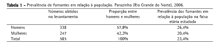 Objective: To outline the prevalence of smoking in the city of Parazinho, Brazil, with the objective of generating data on which to base a plan of action for smoking control programs in the city. Methods: A questionnaire was applied to 150 people (25.6% of whom were smokers) by community health agents during home visits. The questionnaire comprised 30 objective and subjective questions to collect social and biological information on smokers in urban and rural areas. Results: The data were analyzed using descriptive statistics, and the principal findings were as follows: the prevalence of smoking was higher among males (57.8%); most of the interviewees started smoking at an early age (45% before the age of 12); economic conditions constituted a contributing factor (66% of the smokers interviewed earned less than the minimum wage); most of the interviewees reported difficulty in kicking the habit (44.6% reported living with a smoker, and 80% had a friend who smoked); there was a high prevalence of tobacco-related diseases (56.6% had respiratory problems); and there was concomitant alcohol use in 52% of the smokers. Conclusion: This outline can be used in the generation of a local program of smoking prevention and control. Such a program is, in fact, under development. A team of professionals has received training in a 'minimal, intensive approach to the smoker', and a municipal outpatient clinic for the treatment of nicotine dependence has been inaugurated.