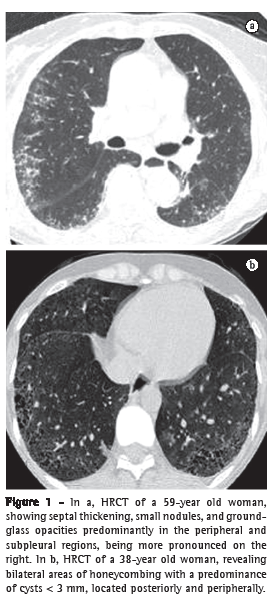 Currently, HRCT is considered the state-of-the-art radiological testing procedure for the detection of pulmonary involvement. Areas of honeycombing can be seen on CT scans, especially in cases of UIP, and is typically interspersed with areas of ground-glass opacity.(6,9,20)