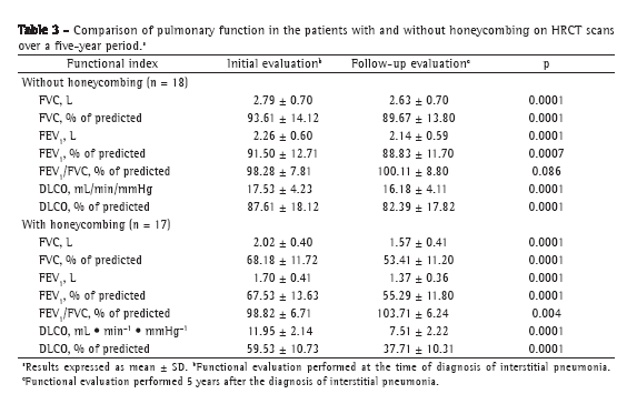 Finally, we compared the absolute deltas of the pulmonary function parameters of the patients with and without honeycombing on the HRCT scans over a five-year period (Table 4). With the exception of the FEV1/FVC ratio, there were statistically significant differences for all functional variables evaluated.