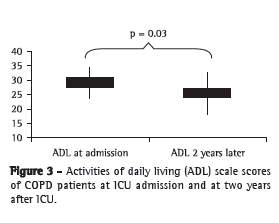 Our data are in agreement with those from that study because we found a significant reduction in Karnofsky scale and ADL scale scores at two years after ICU discharge. It is noteworthy that, after hospital discharge, 18% of the patients in the present study required home oxygen therapy and 6% required ventilatory support, via tracheostomy or noninvasive ventilation, after hospital discharge. One group of authors(26) reported that the quality of life of 73% of patients with COPD improved or remained the same 6 months after ICU discharge, without the need for additional drugs.