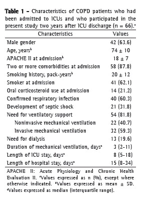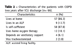 The small sample size is also attributable to difficulties related to the lack of diagnostic criteria, as well as to the diagnostic confusion with asthma, especially in the subgroup of elderly individuals; to the lack of information regarding the severity of COPD, including pulmonary function test results and the need for home oxygen therapy prior to ICU admission; and to the fact that we did not use questionnaires specific to the evaluation of COPD patients.(29,30) Another limitation is the lack of specific assessment of exercise capacity, which has been reported to be greatly impaired in such patients.(12,25)