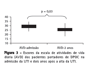 A Tabela 2 demonstra que 86,3% dos pacientes sobreviventes 2 anos após a alta da UTI viviam em seu domicílio, 18,1% necessitavam de oxigênio domiciliar e 6% dependiam de suporte ventilatório. A Figura 2 demonstra uma redução na qualidade de vida dos pacientes quando comparadas as médias da escala de Karnofsky na admissão na UTI e 2 anos após a alta da UTI (85 ± 9 vs. 79 ± 11; p = 0,03). A Figura 3 mostra uma significante perda da autonomia dos mesmos através da comparação das médias dos escores da escala AVD na admissão na UTI e 2 anos após a alta da UTI (29 ± 5 vs. 25 ± 7; p = 0,01).