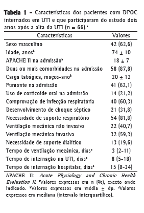 Este estudo de coorte prospectivo teve o objetivo de avaliar o prognóstico dos pacientes internados na UTI e, naqueles que receberam alta, avaliar a qualidade de vida dos sobreviventes 2 anos após a alta da UTI. A força do estudo está no desenho, que é adequado para estudos de prognóstico (coorte) na coleta dos dados; por não ter ocorrido em um único centro; e na ausência de dados semelhantes no Brasil. As limitações do estudo são seu pequeno tamanho amostral devido à elevada taxa de mortalidade dos pacientes no primeiro ano após a alta da UTI, o que não permitiu maiores análises com relação a exacerbações infecciosas vs. não infecciosas, suporte ventilatório invasivo vs. não invasivo e presença vs. ausência de comorbidades; às dificuldades com a falta de critérios diagnósticos e com a confusão diagnóstica com a asma, especialmente no subgrupo de idosos; à ausência de informações referentes à gravidade da DPOC, como testes de função pulmonar e da necessidade de oxigenoterapia domiciliar antes da internação na UTI; e à falta de uso de questionários específicos(29,30) para a avaliação de pacientes com DPOC, além da falta de avaliação específica da capacidade funcional relacionada ao exercício, já que essa parece ser uma das maiores perdas desses pacientes segundo estudos prévios.(12,25)