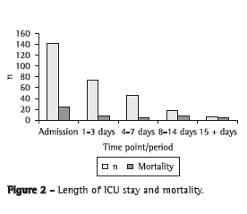 One group of authors(12) concluded that mortality is higher in patients admitted to the ICU a few days after being admitted to the hospital or being transferred from other hospitals than in those admitted directly to the ICU. This difference was attributed to the different characteristics of the patients. In our study, 17 patients had been referred from surrounding hospitals to our hospital, which is a regional hospital.