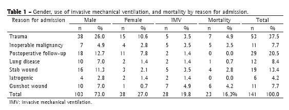 In all of the cases admitted to the ICU, minor surgical interventions performed by the thoracic surgeon were also examined, as were routine procedures, such as the use of oxygen therapy, intravenous catheters, and urinary catheters. Tube thoracostomy was performed in 21 (17.6%) of the patients. Those cases included the patients with postoperative (iatrogenic or non-iatrogenic) pneumothorax or hemothorax. Two of those patients had previously been treated but were admitted to the ICU after being submitted to tube thoracostomy due to pneumothorax. Minor surgical interventions were performed in 12 patients (9.9%). These were invasive interventions, including wound suture, debridement, and fasciotomy. Central venous lines were inserted in 46 patients, and tracheostomy was performed in 14. Four patients were submitted to rigid bronchoscopy because of foreign body aspiration, in 1; for removal of bronchial secretions, in 2; or because of hemorrhage, in 1. In our study, 22 patients required intra-arterial catheterization for blood gas monitoring. Cardiopulmonary resuscitation (CPR) was required in 20 (14.1%) of the patients and was performed twice in 2. All of the patients who required CPR died. In our study, 119 invasive interventions, divided into six groups, were performed in 81 patients (57.4%), and 13 of those patients died. There were 60 patients (42.6%) in whom no invasive intervention was required, and 10 of those patients died. No significant association was found between invasive interventions performed in the ICU and mortality (p > 0.05). The invasive interventions performed in the ICU were central catheterizations, in 46 patients; tube thoracostomy, in 21; minor surgical procedures, in 12; tracheostomy, in 14; and other interventions, in 26.