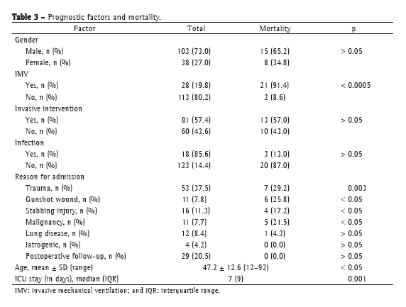 The reason for admission is one of the basic factors influencing mortality in ICU patients. It is closely associated with the approach taken and with morbidity. In a study involving 5,030 medical or surgical ICU patients, the reported annual mortality rate was ≥ 40%.(6) Considering the cases admitted to our ICU, the most common reason for admission was chest trauma. Traffic accidents accounted for the majority of the cases, and there was secondary trauma in 34 cases due to penetrating chest injury. Of the 53 trauma patients, 38 (26%) were male. However, no significant association could be detected between male gender and mortality due to trauma. In one study investigating COPD and ARDS patients,(10) the mortality rate was 34%, increasing to 46% when invasive MV was also considered.