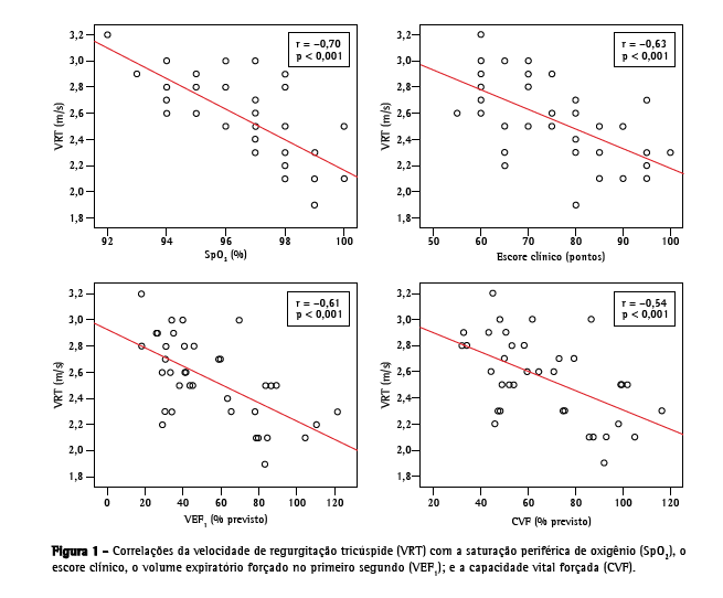 Em nosso estudo, a VRT correlacionou-se significativamente com o VEF1 e a CVF (Figura 1). Os pacientes com VRT >2,5 m/s apresentaram valores significativamente menores de VEF1 e CVF. Outros pesquisadores(8) estimaram que mais de 40% da população de adultos com FC e com doença pulmonar grave tinham HP sem sinais clínicos de cor pulmonale. Pacientes com melhor função pulmonar (VEF1 > 40% do predito) apresentaram menor incidência de HP.