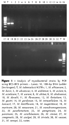 The rapid identification of M. tuberculosis is crucial to optimizing patient recovery. Species identification can take several weeks to complete, during which time the patient might receive inappropriate antimycobacterial agents. This is particularly worrisome if the patient is infected with M. bovis rather than M. tuberculosis, since M. bovis is resistant to pyrazinamide, a first-line antitubercular drug.(19) In the present study, we designed and tested the primers BC3 and BC5, which differentiate M. tuberculosis from M. bovis. The genomic fragment designated mtp40 has been tested as a species-specific DNA target for the identification of M. tuberculosis.(24) However, the mtp40 sequence has been shown to be absent from a number of M. tuberculosis strains.(18,25) Interestingly, the mtp40 sequence has been shown to be part of the plcA gene.(25) In the present study, we used primers flanking the junction of the 3' end of the plcB gene and the 5' end of the plcC gene. In addition, our attempts to amplify a DNA fragment comprising the 3' end of the plcA gene, the intergenic region, as well as one comprising the 5' end of the plcB gene, failed (data not shown).