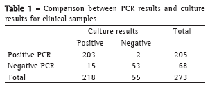 Of the 273 clinical samples analyzed by PCR (Table 1), 93.8% were in agreement with the culture results (p < 0.001). Only 2 of the 55 culture-negative samples were identified as positive in the PCR. However, 15 of the 203 culture-positive samples were identified as negative in the PCR. Comparing the PCR results with the culture results, the sensitivity, specificity, positive predictive value, and negative predictive value were, respectively, 93.1% (CI: 88.7-96.0), 96.4% (CI: 96.1-99.4), 99% (CI: 96.1-99.8), and 77.9% (CI: 65.9-86.7). The Kappa value (0.82) showed that there was a near-perfect concordance between the two tests. These results compare favorably with those compiled in a recent review of the literature.(8)