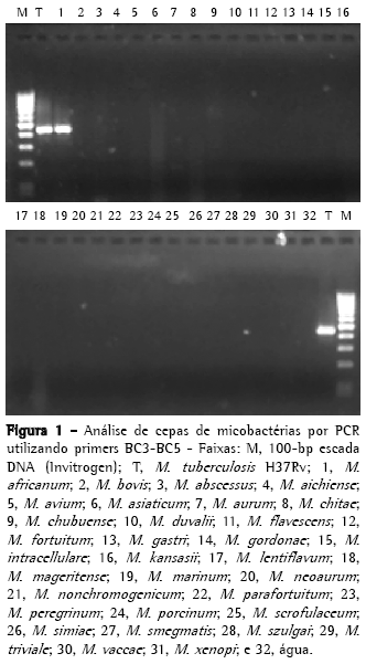 As cepas de micobactérias e amostras clínicas foram inativadas a 95 °C por 10 min. O DNA foi extraído utilizando-se o QIAamp Tissue DNA Kit (Qiagen, Hilden, Alemanha), de acordo com as instruções do fabricante. O DNA purificado (10 µl) foi adicionado a 40 µl de mistura reagente contendo 20 mM Tris-HCl (pH 8,4), 50 mM KCl, 2,0 mM MgCl2, 1,0 U Platinum Taq DNA polimerase (Invitrogen Life Technologies, Gaithersburg, MD, EUA), e 0,2 mM dNTPs (Invitrogen Life Technologies), junto com 10 pmol de cada um dos primers BC3 (5'-TCGACGGCAGAAAGCGTGCC-3') e BC5 (5'-GCGGCTCAATGCGCTTCCG-3'). Os primers BC3 (complementos de bases 200266 a 200285) e BC5 (bases 200679 a 200697), que se baseiam na seqüência H37Rv do M. tuberculosis (EMBL, número de acesso BX842579), amplificaram um fragmento de DNA 432-bp compreendendo o 3' terminal do gene plcB, a região intergênica, e o 5' terminal do gene plcC. A amplificação pela PCR foi realizada como se segue: desnaturação inicial a 94 °C por 5 min; 35 ciclos de desnaturação a 94 °C por 30 s, anelamento a 65 °C por 30 s, extensão a 72 °C por 30 s; e uma etapa de extensão final a 72 °C por 5 min. Os produtos PCR foram analisados por eletroforese em gel de agarose (2% w/v) e corados com brometo de etídeo. As amostras clínicas também foram amplificadas com primers específicos para os genes GH20 e PC04 de ß-globina humana,(22) a fim de detectar amostras inibidoras.