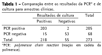 Das 273 amostras clínicas analisadas por PCR (Tabela 1), 93,8% estavam de acordo com os resultados da cultura (p < 0,001). Apenas 2 das 55 amostras negativas de cultura foram identificadas como positivas na PCR. Entretanto, 15 das 203 amostras positivas de cultura foram identificadas como negativas na PCR. Comparando-se os resultados da PCR com os da cultura, a sensibilidade, especificidade, valor preditivo positivo, e valor preditivo negativo foram, respectivamente, 93,1% (IC: 88,7-96,0), 96,4% (IC: 96,1-99,4), 99% (IC: 96,1-99,8), e 77,9% (IC: 65,9-86,7). O valor de Kappa (0,82) mostrou que houve concordância quase perfeita entre os dois testes. Estes resultados são favoravelmente comparáveis aos compilados em recente revisão da literatura.(8)