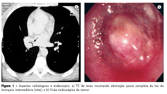 O tratamento de escolha continua sendo a cirurgia conservadora,(1) embora seu comportamento localmente agressivo obrigue eventualmente a procedimentos mais radicais, como, por exemplo, a pneumonectomia. Outros relatos da literatura(4,6) mostram que há bons resultados quando se realiza a broncoplastia para o tratamento desses tumores. No presente caso, a proximidade com o brônquio do lobo médio assim como sua extensão dentro do brônquio intermediário exigiu a realização da broncoplastia para busca de margens livres e preservação do lobo médio. A enucleação de nódulos não é recomendada por sua chance de recidiva.(5) A radioterapia e a corticoterapia podem ser consideradas em pacientes com recidiva, em pacientes submetidos à ressecção incompleta ou em pacientes sem condições clínicas para ressecção pulmonar.(7,8) O prognóstico parece ser excelente quando a ressecção cirúrgica é completa.(1,5)