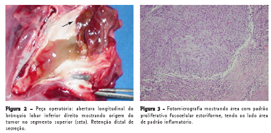 Um paciente masculino de 36 anos, não tabagista, internou-se para investigação de tosse crônica e sibilância. O exame físico demonstrou sibilo expiratório à direita. A radiografia simples de tórax evidenciou atelectasia do lobo inferior direito, enquanto a tomografia de tórax demonstrou a presença de uma imagem endobrônquica (Figura 1a). A broncoscopia identificou uma lesão vegetante que ocluía completamente o brônquio intermediário (Figura 1b) e a biópsia sugeriu o diagnóstico de hemangioma. O paciente foi estadiado sistematicamente devido à hipótese de se tratar de uma neoplasia brônquica. Sem evidência de comprometimento loco-regional ou à distância, o paciente foi submetido a uma toracotomia lateral direita para ressecção do lobo inferior. Devido a sua extensão endobrônquica, com comprometimento do brônquio intermediário e não invasão do brônquio lobar médio, decidiu-se realizar lobectomia inferior com ressecção parcial do brônquio intermediário e uma reconstrução com anastomose entre a parte proximal do brônquio intermediário e o brônquio lobar médio. O paciente teve uma evolução pós-operatória sem intercorrências e recebeu alta no quinto dia pós-operatório. O tumor originava-se no brônquio segmentar superior do lobo inferior direito (Figura 2). O diagnóstico anátomo-patológico foi de pseudotumor inflamatório do tipo fibrohistiocítico (Figura 3), confirmado por imunohistoquímica.