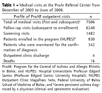 ResultsProAR treatment profilePatients with severe asthma (n = 1730) were monitored by a multidisciplinary health care team and received free medication for asthma from December of 2003 to June of 2006. During this period, 930 patients were provided medical care at the ProAr Referral Center. The main characteristics of treatment at the ProAR Referral Center are listed in Table 1.