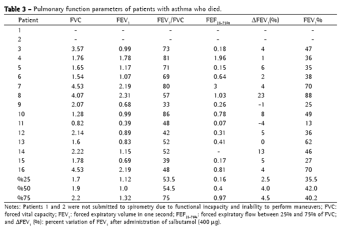 Study design and mortality data collectionThis was a descriptive, retrospective, observational study in which data were collected from the clinical charts and death certificates of 16 patients with asthma monitored at the ProAr Referral Center who ultimately died between December of 2003 and June of 2006. Primary and secondary causes related to mortality, as well as place and time of death, were collected from the death certificates. Demographic and clinical characteristics, as well as details regarding asthma treatment, were collected from the ProAr outpatient clinical charts.