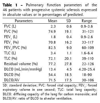 This was a cross-sectional study of a convenience sample comprising forty-six consecutive patients monitored between March and December of 2004 at the Federal University of Bahia Professor Edgard Santos University Hospital Outpatient Clinic for Interstitial Diseases, to which they had been referred, according to a pre-established evaluation protocol, regardless of the presence of respiratory symptoms. The diagnosis of PSS (limited and diffuse forms) was confirmed in all forty-six patients.