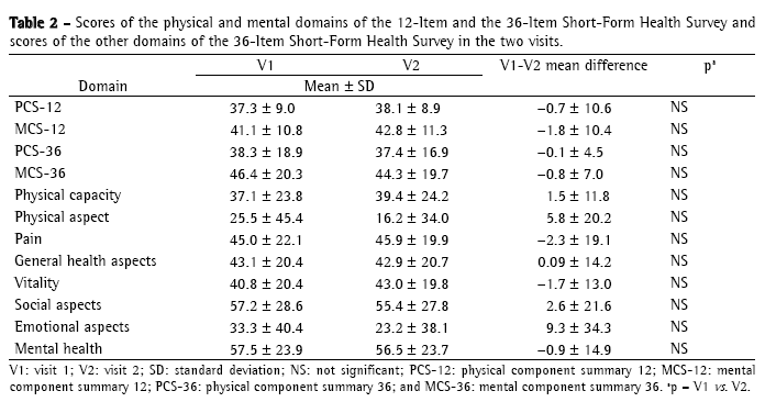 It is known that clinical, radiological, and functional data might not express with precision the real impact of the disease on the activities of daily living of the individual.(4) The evaluation of health-related quality of life through standardized questionnaires aims at codifying subjective patient perception with objective data, thereby facilitating the analysis of this outcome measure in a quantitative research environment.(5,6)