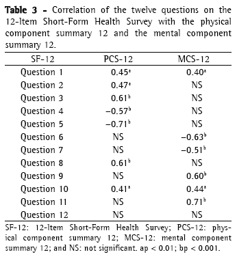 The construct validity was evaluated by determining how the PCS-12 and the MCS-12 correlated with each of the eight SF-36 domains, as well as with the PCS-36 and MCS-36 scores, using Pearson's correlation coefficient. The PCS-12 correlated significantly with the PCS-36 (r = 0.59; p < 0.001); the MCS-36 (r = 0.45; p < 0.01); physical capacity (r = 0.62; p < 0.01); pain (r = 0.46, p < 0.01); vitality (r = 0.59; p < 0.001); and social aspects (r = 0.56; p < 0.001). The MCS-12 was significantly correlated with the PCS-36 (r = 0.45; p < 0.01); the MCS-36 (r = 0.60; p < 0.001); pain (r = 0.43; p < 0.01); vitality (r = 0.46; p < 0.01); general aspects of health (r = 0.43; p < 0.01); social aspects (r = 0.40; p < 0.01); emotional aspects (r = 0.43; p < 0.01); and mental health (r = 0.66; p < 0.001). The other correlations were not significant (data not shown).