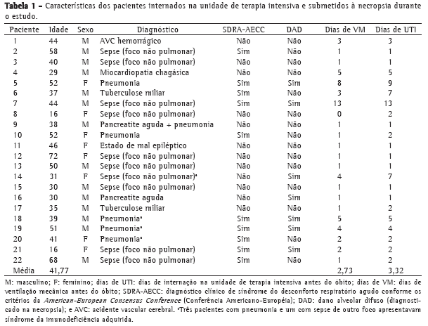 Durante o período de estudo, 592 pacientes faleceram na UTI, entretanto, somente 22 (3,7%) foram submetidos à necropsia. A Tabela 1 mostra as características clínicas e demográficas, os diagnósticos clínicos, a presença ou não dos critérios da AECC para SDRA, a presença ou não de DAD na necropsia, a duração da internação na UTI e da ventilação mecânica antes do óbito.