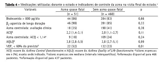 A Tabela 4 demonstra que o escore de sintomas pelo ACQ e o escore de qualidade de vida pelo AQLQ, realizados na subamostra de pacientes na V5 (após um ano de acompanhamento e tratamento) foi similar entre pacientes com e sem histórico de asma quase fatal. A proporção de pacientes que negaram sintomas de asma na consulta com o pneumologista e aquela de pacientes com asma controlada de acordo com o ACQ também foi similar entre os dois grupos. A dose das medicações prescritas para o tratamento da asma durante o estudo foi semelhante entre os grupos. A frequência de obstrução grave das vias aéreas após o tratamento permaneceu maior nos pacientes com histórico de asma quase fatal.