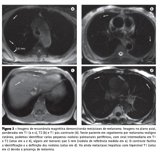 Os avanços recentes também já permitem a obtenção de imagens de RM do corpo inteiro (principalmente com sequências HASTE e short TI inversion recovery), e seu uso tem sido investigado como uma técnica de rastreamento para neoplasias, para a pesquisa de metástases e na doença aterosclerótica cerebral e coronariana, por meio de angiografia arterial por RM (angio-RM). Essas técnicas podem se tornar um método simples, de baixo risco e efetivo para a detecção de lesões à distância do câncer pulmonar, mas ainda precisam ter seu papel melhor estabelecido.(16,17)