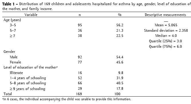 Table 1 shows some individual and family aspects of the 169 patients with asthma. The mean age of the patients was 5 years, 54.4% (92/169) being male and 45.6% (77/169) being female. Regarding maternal level of education, it was found that 9.8% (16/163) of the mothers were illiterate, and that 72.4% (118/163) had only 1 to 8 years of schooling.