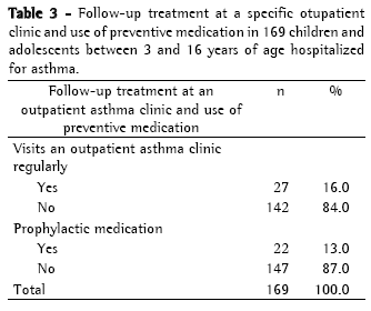 Regarding the follow-up treatment of asthma, the patients were asked whether they had ever been referred for outpatient treatment in the intervals between asthma attacks by any health professional in the emergency room, whether they had visited any health care facility regularly before being hospitalized, and whether they had received any prophylactic medication. The definition of prophylactic medication was that established in the III Brazilian Consensus on Asthma Management guidelines.(19)