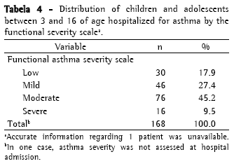 Table 4 shows the distribution of the hospitalized patients by asthma severity. We observed that most (54.7%; 92/168) of these patients had moderate or severe persistent asthma.