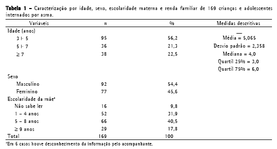 Na Tabela 1 encontram-se alguns aspectos individuais e familiares relativos aos 169 pacientes asmáticos. A média de idade dos pacientes foi de 5 anos, sendo que 54,4% deles (92/169) eram do sexo masculino e 45,6% (77/169), do sexo feminino. Em relação à escolaridade materna, verificou-se que 9,8% (16/ 163) das mães não sabiam ler e que 72,4% (118/163) delas possuíam de 1 a 8 anos de estudo.