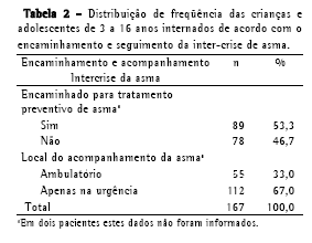 Os aspectos do acompanhamento ambulatorial preventivo da asma são mostrados na Tabela 2. Em mais da metade dos casos, 53,3% (89/167 - dados referentes a 2 pacientes não foram fornecidos), havia encaminhamento prévio pelo médico da urgência para atendimento ambulatorial preventivo da doença. Contudo, a maioria das crianças e adolescentes, 67% (112/167), era atendida exclusivamente em serviço de urgência e apenas 33% (55/167) freqüentava ambulatório geral ou específico para a prevenção de asma.