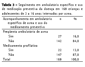 Na Tabela 3, observa-se que apenas 16% (27/169) dos pacientes internados freqüentavam ambulatório específico para atendimento preventivo da asma e que em somente 13% (22/169) dos casos houve relato de prescrição de medicação profilática.