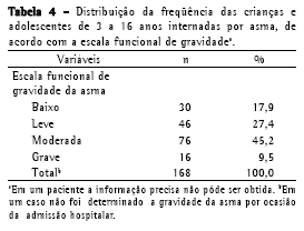A Tabela 4 mostra a classificação da asma entre os pacientes internados). Observa-se que a maioria desses pacientes, 54,7% (92/168), apresentava asma persistente moderada ou grave.
