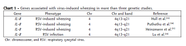 Furthermore, the findings suggested that RSV bronchiolitis and asthma have at least some different genetic factors: the same promoter polymorphism in IL-8 that causes susceptibility to RSV bronchiolitis might protect against asthma. The results might suggest a distinct and even opposite role of IL-8 in atopic and non-atopic wheezing. Further studies provide evidence of a genetic susceptibility determinant for RSV bronchiolitis.(31-35) In a genetic association analyses, they investigated a SNP located-251 nt relative to the IL-8 transcriptional start site. Hull et al. showed a trend for increased IL-8 production in association with the IL-8-251A allele when blood is stimulated with LPS.(32) Analysis of cases of RSV bronchiolitis showed that the IL-8-251A allele is significantly associated with the severity of the disease. The effect was most marked for severe disease requiring oxygen therapy for more than two days, and for cases of bronchiolitis with no other known risk factors.