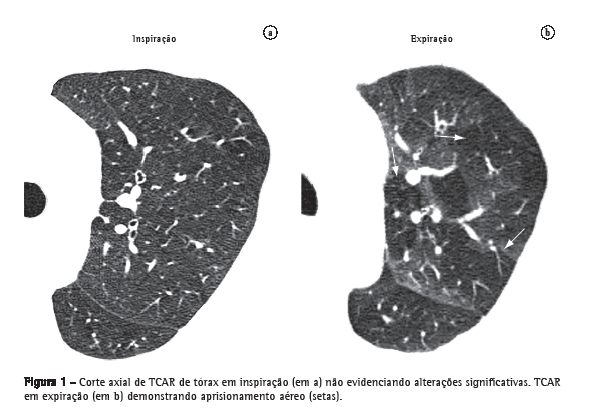 O aprisionamento aéreo secundário à obstrução brônquica ou bronquiolar pode produzir focos parenquimatosos de redução da atenuação, que se acentuam nas imagens de TC obtidas em fase expiratória.(8) Na enfermidade obliterativa de pequenas vias aéreas e na afecção vascular oclusiva, as áreas com atenuação diminuída são as anormais e geralmente contêm vasos pulmonares em número e tamanho menor que o pulmão normal adjacente, que pode ter atenuação normal ou aumentada (por causa do redirecionamento do fluxo sanguíneo). O padrão de atenuação em mosaico pode também ser produzido por doença pulmonar parenquimatosa, caracterizada por opacidade em vidro fosco, sendo que nessa condição as áreas de maior atenuação representam as regiões acometidas, e as outras zonas