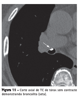 BroncolitoLinfonodo peribrônquico calcificado que erode para o interior do brônquio adjacente, geralmente secundário a infecções por Histoplasma sp. ou Mycobacterium tuberculosis. Na TC, é identificado como um pequeno foco de calcificação dentro da ou adjacente à via aérea, mais frequentemente no brônquio do lobo médio (Figura 11). Distalmente, pode existir impacção de secreções, bronquiectasias ou atelectasia.(24,25)