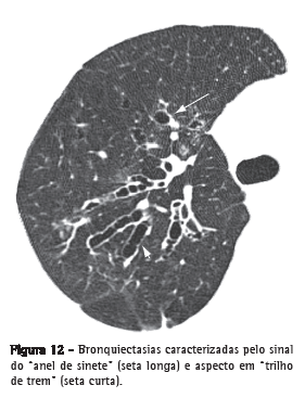 BronquiectasiaDilatação brônquica irreversível, que pode ser focal ou difusa. Geralmente decorre de infecção crônica, obstrução das vias aéreas proximais ou anormalidades brônquicas congênitas. Os achados morfológicos na TCAR (Figura 12) incluem o diâmetro interno do brônquio maior do que o da artéria pulmonar adjacente (sinal do anel de sinete); a perda do afilamento gradual do brônquio, definido como a manutenção do calibre por mais que 2 cm, distal à bifurcação (aspecto em "trilho de trem"); e a identificação de via aérea a menos de 1 cm da superfície pleural.