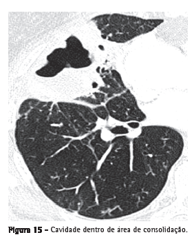 Cavidade (escavação)Representa espaço que contém gás, com ou sem nível líquido, dentro de um nódulo, massa ou consolidação pulmonar. Geralmente ocorre pela eliminação ou pela drenagem da parte necrótica pela via aérea (Figura 15) ou para o espaço pleural. As paredes costumam ter contornos irregulares e medir mais de 1 mm de espessura. "Cavidade" não é sinônimo de "abscesso". O termo "cavitação" não deve ser usado como sinônimo de "escavação": na língua portuguesa, "cavitação" tem significado diferente, e seu uso é incorreto.(7)