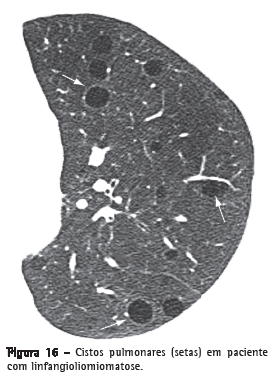 CistoCisto é qualquer espaço arredondado, bem circunscrito, que é circundado por uma parede epitelizada ou fibrosa, de espessura variável.(29) Na TC, caracteriza-se por uma área arredondada de baixo coeficiente de atenuação no parênquima pulmonar com uma interface bem definida com o pulmão normal adjacente (Figura 16).(1,7) A espessura da parede do cisto pode variar, sendo normalmente fina (< 2 mm). Cistos geralmente contêm ar, mas, ocasionalmente, podem conter líquido (por ex.: cisto broncogênico) ou mesmo algum material sólido. Doenças que cursam geralmente com múltiplos cistos pulmonares incluem a linfangioliomiomatose, a histiocitose de células de Langerhans, a pneumonia intersticial linfocítica e a síndrome de Birt-Hogg-Dubé.(30,31)